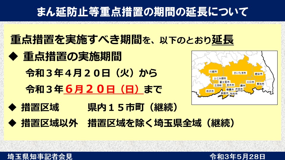 è¿'ã from www.yuyashiki.com 【nhk】埼玉県のまん延防止等重点措置の対応などについて掲載しています。 対象 ・4月20日 さいたま市 川口市 ・4月28日追加 越谷市 草加市 蕨市. 措置区域以外 ・措置区域を除く、埼玉県全域 2 実施期間 令和3年4月20日(火曜日)から令和3年6月20日(日曜日)まで ただし、3、4に掲げる要請内容等は、令和3年6月1日(火曜日)からとする。 3 まん延防止等重点措置等の内容 埼玉県 におけるまん延防止等重点措置等 について、以下のとおり市民の皆様にもご協力をお願いいたします。 埼玉県におけるまん延防止等重点措置等に基づく協力要請について【5月20日追加要請】 1 まん延防止等重点措置の対象区域